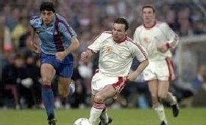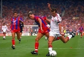 Wallace, bubbly and effervescent, in the course of the club’s winning of the FA Cup in 1990, the longer, fast legs of Sharpe, were on the left wing for the May 15th, 1991, European Cup Winners’ Cup Final defeat of Barcelona, 2-1, at Stadion Feijenoord, ‘De Kuip’ (‘The Tub’), Rotterdam, the Netherlands. Hughes, from a Robson free-kick, half-way inside the Barça half, center, left-footed, found Bruce there to direct a header, right of center of the 18 yard box. Mark racing in, to tap the ball, left-footed, into the net; inside the left post, as it fell, 1-0, in the 67th minute. Hughes, rounding ‘keeper, Carles Busquets, well outside the 18 yard box, forced out wide, to its center; right edge, acutely angled, the ball low, right-footed, inside the post, far left, 2-0, in the 74th minute. Before Dutch defensive midfielder, Ronald Koeman’s free-kick on 79 minutes, 2-1.