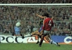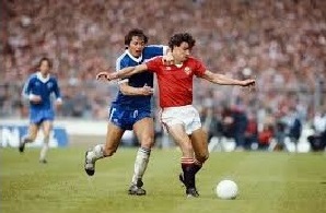 England captain in 1976, before Robson, loosely comfortable on the ball, Ray ‘Butch’ Wilkins, brought for the 1979-80 term, 37 (2) that season, from Chelsea for £750,000 to give some purposeful calm to the midfield by Dave Sexton, manager after ‘The Doc’, in the 72nd minute jiggered a second, with a trademark curler, left-footed, edge of the 18 yard box, right, 2-1, top left corner, but would be sold to AC Milan of the San Siro for £1.5m for the 1984-85 season by Atkinson; a contributory factor in Ron’s eventual dismissal. The replay, on May 26th, 1983, was won, 4-0.