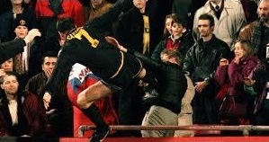 Robson, midfielders, Clayton Blackmore and Mike Phelan, left at the end of the 1993-94 season. Brian to manage Middlesboro’; Clayton to play for him and coach on a free transfer, and Mike on a free to West Bromwich Albion. The 1994-95 term was a disappointment. Eric, sent off, in the 48th minute at Crystal Palace, on January 25th, 1995, with the score, 0-0, for kicking at Palace defender, Richard Shaw, was suspended by the FA for launching into the crowd. Delivering a martial arts, ‘kung-fu’, style kick, and punches at a fan on the terrace, Matthew Simmons, Cantona alleged provocation, ‘Fuck off back to France, you French bastard.’1 The match ended, 1-1, with calculatingly efficacious center half, David May, 15+4 (2) that season, squad stalwart at the far post, heading down a left-footed cross from left winger Sharpe, 26+2 (3), from left of the 18 yard box, by the touchline, and Palace ‘keeper Martyn able only to push it into his net; giving United the lead in the 57th minute, 1-0.