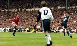 1995-96 saw the emergence of ‘the famous five’; coolly aloof right winger, and specialist free-kick taker, David Beckham, 26+7 (7); hard-tackling central midfield ball-distributor, Nicky Butt, 31+1 (2); technically outstanding full backs, Phil, 21+3, and Gary Neville, 30+1, and attacking midfielder, Paul, ‘he scores goals’, Scholes: the head of the diamond. That Alex had great faith in these young stars was evident from his sale of bruiser Ince to Italian Serie A club, Internazionale of Milan, for £7.5m, and Kanchelskis to Everton for £5m. The league was won by 4 points from Newcastle United on 82, with Cantona, 30 (14), Giggs, 30+3 (11), Cole, 32+2 (11), and Scholes, 16+10 (10), the contributors in double figures, while the club’s second ‘double’ was completed at Wembley, in the May 11th, 1996, FA Cup Final against Liverpool, 1-0, after ‘keeper, David James, on 86 minutes, failed to punch a corner away, and through a crowded penalty area Cantona volleyed the ball into the net.