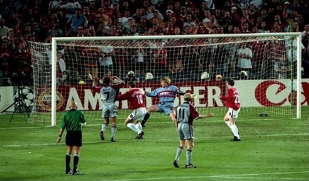 In the second leg in Turin, on April 21st, 1999, United were down, 0-1, to a 6th minute strike by ‘Zebras’ center forward, Filippo Inzaghi. From a corner, taken short by France’s attacking midfield (AM) genius, Zinedine Zidane, returned by left winger, Angelo Di Livio, and crossed to the far-post, Inzaghi volleyed in, right-footed; ignoring the despairing attempt of Gary Neville to manhandle him. Five minutes later, left back, Gianluca Pessotto, past the halfway line, on the left-wing, right-footed, forward to Inzaghi, left edge of the area. Filippo, left corner, outside the 6 yard box, left-footed, deflecting off center back Stam’s outstretched boot; looping over ‘Great Dane’, ‘keeper Peter Schmeichel, 0-2.