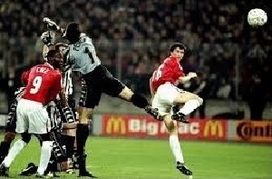 United drew, 1-1, on April 7th, 1999, at home in the first leg against Juventus, i bianconeri, ‘the black and whites’, although that wasn’t on until 90+2 minutes, when the defence’s headed clearance of Beckham’s overhead kick, into the penalty area, could only reach Giggs, left corner of the 6 yard box; striking past Juvé ‘keeper, Angelo Peruzzi, left-footed into the top right corner.